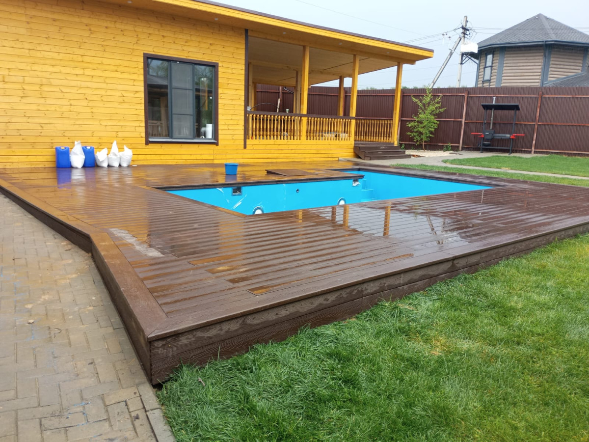 Смонтирован настил у бассейна (металлокаркас на сваях). Торцы зашиты доской. По периметру отделка ступенью шириной 165 мм.
