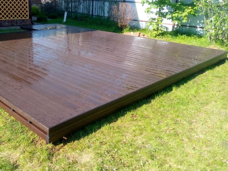 Настил из террасной доски включает в себя основание, на котором монтируется каркас из лаг, поверх которого крепится непосредственно сама доска. Основанием для настила может быть фундамент или бетонная стяжка.