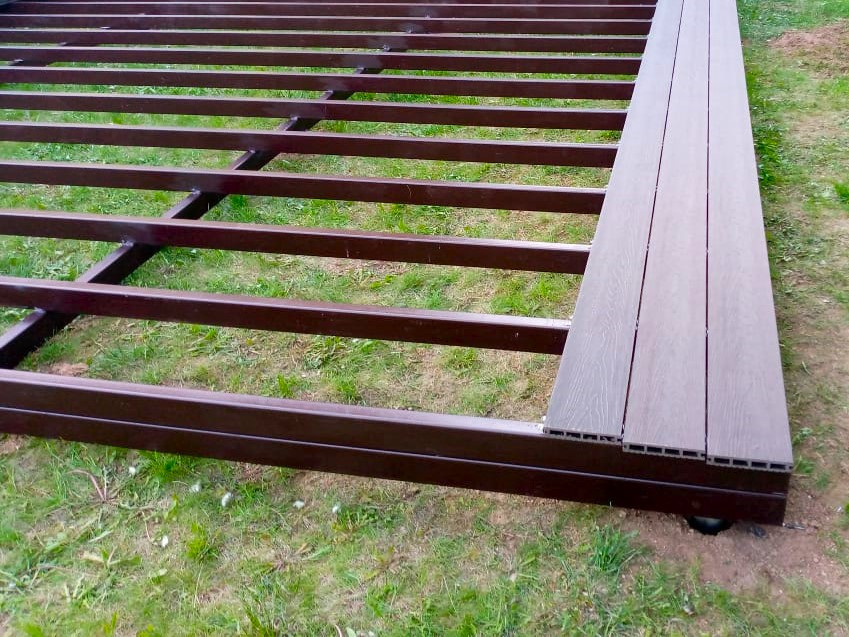 Лаги для укладки террасной доски производятся из древесно-полимерного композита или изготавливаются из алюминиевого профиля. В некоторых случаях их можно заменить на деревянные. Они крепятся на каркас на саморезы или анкеры с интервалом 0,3 - 0,4м.
