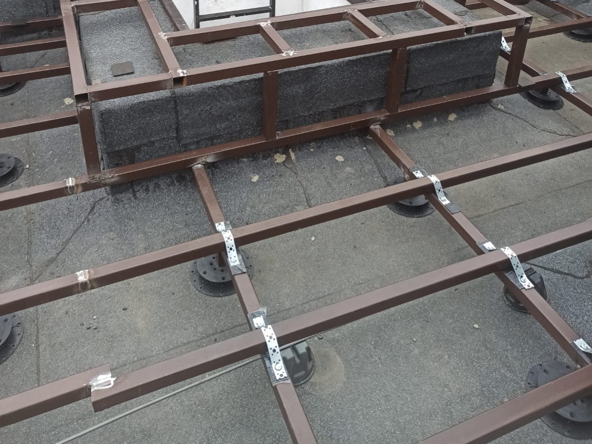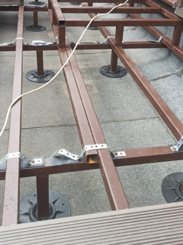 Экономичную и надежную конструкцию обеспечивают винтовые сваи, в том числе позволяющие сделать настил вентилируемым. После установки свай, на них устанавливается стальной каркас, имеющий уклон до 2 градусов в направлении укладки террасной доски. Это обеспечит естественный водоотвод. Установленный каркас окрашивают и дают высохнуть. Затем следует монтаж лаг.