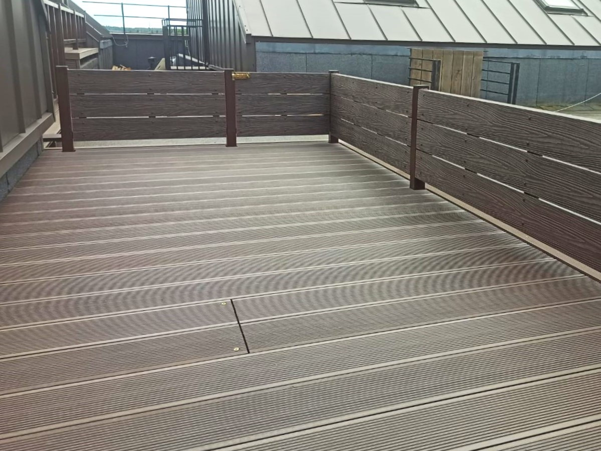 Главным условием правильного монтажа настила из террасной доски является обеспечение зазора между досками. Рекомендованный производителем крепёж должен обеспечить необходимый размер зазора. По окончанию укладки настила и установки завершающего крепежа, выступающие над лагами доски обрезают не более 5 см от края. Срезы доски закрываются декоративными торцевыми элементами. Настил готов, его необходимо промыть струёй воды для удаления строительного мусора, дать просохнуть, после чего можно приступать к установке перил и ограждений. Возможно Вам будет интересно: